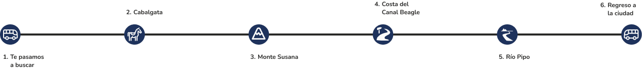 La vuelta se disfruta nuevamente entre los senderos del Monte Susana, atravesando el bosque y reviviendo la tranquilidad que acompaña toda la cabalgata. En este tramo final, el Río Pipo vuelve a aparecer en el camino y vas a vivir uno de los momentos más entretenidos de la experiencia: vadearlo a caballo antes de continuar la vuelta al centro hípico, completando una experiencia que combina historia, paisaje y aventura a caballo en Ushuaia.