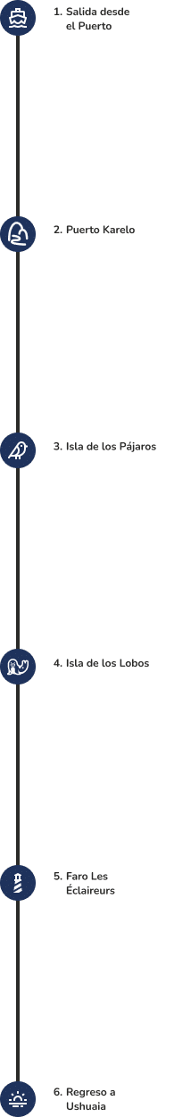 Nos encontramos directamente en el Puerto Turístico, ubicado a pocas cuadras del centro de la ciudad, y nos preparamos para la aventura que vamos a vivir. Desde el instante en que subís al catamarán, vas a sentir la emoción única de navegar por uno de los canales más famosos del mundo. El aire austral, la vista panorámica de Ushuaia desde el agua y la comodidad de nuestro catamarán te aseguran una experiencia memorable desde el primer minuto.