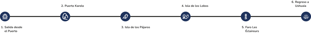 Vas a contemplar las imponentes vistas panorámicas del cordón montañoso Martial, que rodea la ciudad de Ushuaia, mientras regresás hacia el Puerto Turístico. Este momento tranquilo y contemplativo es ideal para relajarte, revivir las emociones del día y despedirte navegando por las aguas más emblemáticas del Fin del Mundo.