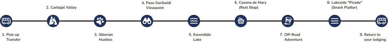 The Classic 4x4 Lakes tour in Ushuaia packs the best of the all-terrain adventure at the End of the World. Onboard our 4x4 trucks you'll travel along thes Scenic National Route N°3, with stops at the Valle Carbajal viewpoint and at Siberianos del Fuego to meet the Siberian huskies. From the Paso Garibaldi viewpoint you'll see two iconic postcards: Escondido Lake and the Fagnano Lake. The experience gets a boost with the adrenaline of the off-road trail in the Bombilla Natural Reserve and a perfect closing with a "picada" (a classic Argentine snack platter) on the shores of Fagnano Lake.