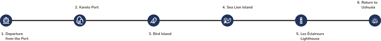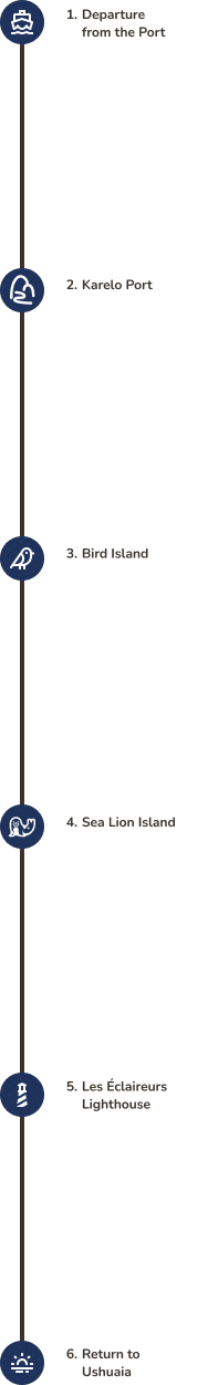 We meet directly at the Tourist Port, located just a few blocks from the city center, and prepare for the adventure we are about to experience. From the moment you step onto the catamaran, you'll feel the unique thrill of navigating one of the world's most famous channels. The Austral air, the panoramic view of Ushuaia from the water, and the comfort of our catamaran ensure a memorable experience from the very first minute.