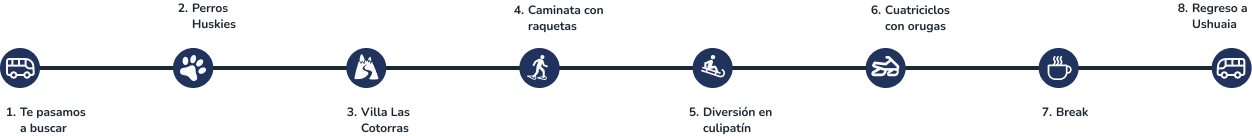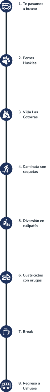 ¿Querés vivir una verdadera jornada de invierno en Ushuaia, featuring paisajes nevados, huskies, emoción y diversión? Esta experiencia fue diseñada para que disfrutes al máximo of the invierno en el Fin del Mundo, featuring actividades exclusivas de la temporada y una conexión total con la nieve. Todo comienza cuando we pick you up directly from your accommodation in Ushuaia y nos dirigimos rumbo a la Ruta Nacional N.º 3, la única vía de acceso que conecta la southernmost city in the world with the rest of Tierra del Fuego. A medida que salimos de la ciudad, dejamos atrás las casas, las calles y el movimiento urbano para adentrarnos en otro mundo: valles, turberas, montañas y los bosques de Ushuaia cubiertos completamente de blanco. Un panoramic point importante es el extenso Carbajal Valley, con sus turbales y montañas cubiertos de nieve realzando la belleza del End of the World en su estación más mágica. La primera parada es una de las más encantadoras: el criadero de huskies siberianos, donde vas a conocer de cerca a estos famosos perritos que representan el alma del invierno en Ushuaia. Vas a poder acariciarlos, jugar con ellos, sacarte fotos y compartir un momento tierno, cálido y divertido. Es imposible no sonreír rodeado de su energía. Desde ahí seguimos hacia el corazón de la experiencia: el historic winter center Villa Las Cotorras. Rodeado de montañas, bosque y nieve virgen, este rincón parece sacado de un cuento. Y es en ese paisaje donde vas a vivir un día lleno de aventura. Vas a caminar con raquetas de nieve por el valle cubierto completamente de blanco, sintiendo el crujido de la nieve bajo tus pies mientras respirás el aire puro del lugar. Vas a deslizarte en culipatín, riéndote como cuando eras chico, cayéndote en la nieve blanda y volviendo a intentarlo una y otra vez. Después, vas a recorrer el valle en cuatriciclos con orugas sintiendo la adrenaline a flor de piel, subido a un vehículo preparado para moverse sobre la nieve, atravesando estos paisajes abiertos con emoción y adrenalina. Vamos a hacer una pausa para recargar energías, con un break reconfortante después de tantas risas y diversión disfrutando de la nieve: vamos a comer cosas ricas y a tomar algo calentito para entrar en calor. Cuando la jornada termina, emprendemos el regreso por la misma ruta escénica. Pero ahora no la vas a mirar igual. Porque ya estuviste ahí. Porque ya formás parte de ese paisaje. Volvemos a Ushuaia and te dejamos en nuestra oficina del centro, con la sonrisa en el rostro y la certeza de haber vivido un día que vas a recordar para siempre. Si todavía no lo viviste, solo te falta una cosa: animarte. La nieve te está esperando. ¡Sumate a Experiencia Nieve y viví lo mejor del invierno de Ushuaia de la mano de oriundos y expertos!