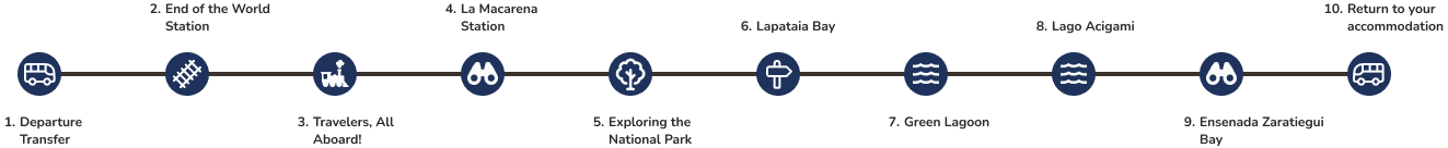 ⏳ Duration (approx.): 5 hours. 📍 Meeting Point: We will pick you up at our office in the city center of Ushuaia and drop you off at your accommodation upon return. 🕘 Departure Times (approx.): 2:00 p.m. 🕘 Return Times (approx.): 7:00 p.m.