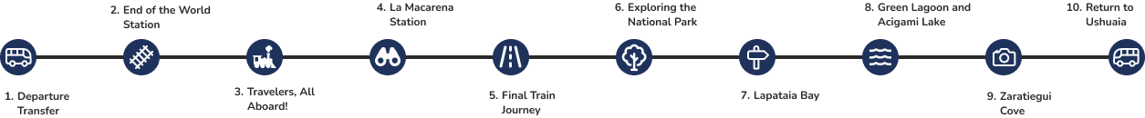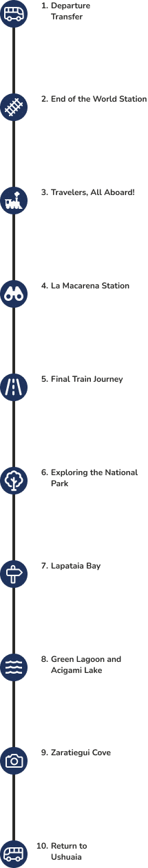 From that very moment, you will know that this day will be unforgettable. We'll head towards the southwestern area of the city, en route to the legendary Tierra del Fuego National Park. Just 12 km from Ushuaia, famous End of the World Train, ready to take you on a thrilling journey to the heart of Fuegian history..