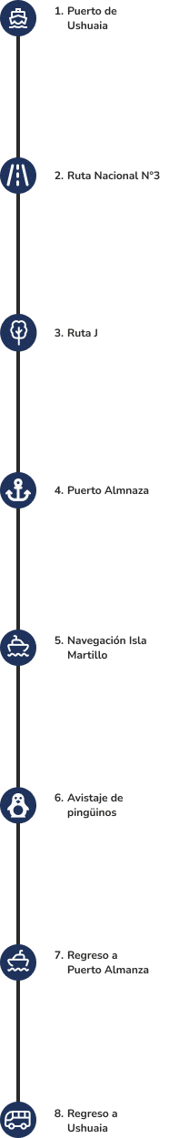 Upon disembarking at Almanza Port, we get back on the land route towards Ushuaia. Te llevamos de regreso al Ushuaia Tourist Port booths with a relaxed body and a soul full of unforgettable images: penguins in the wild, untouched landscapes and a extraordinary journey that only a few lucky travelers get to experience.
