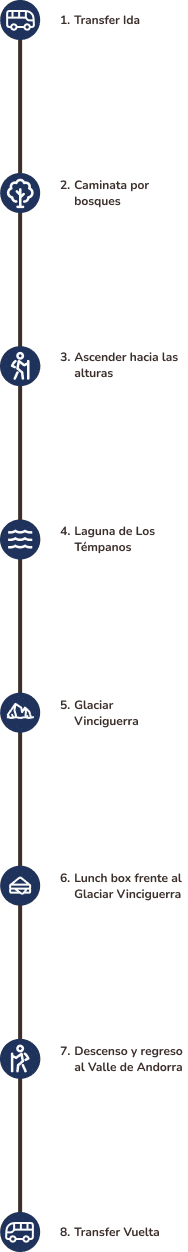 Después del descanso frente al Vinciguerra Glacier Trekking, comenzamos el regreso por el mismo sendero hacia el Andorra Valley, donde inició el trekking. El descenso permite volver a atravesar forest, turbales and the entorno de montaña con la satisfacción de haber completado el desafío de llegar al Glaciar Vinciguerra.
