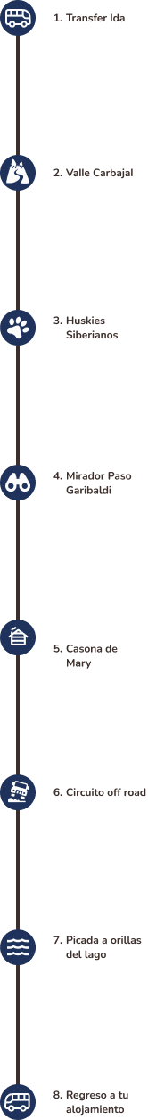 A bordo de nuestras camionetas 4×4 vamos a recorrer la Ruta Nacional N°3 en dirección norte, con paradas en el mirador del Valle Carbajal y en Siberianos de Fuego, donde vas a conocer a los famosos perritos huskies siberianos. Durante el camino, vas a descubrir la ubicación de los centros invernales de Ushuaia, como el Cerro Castor, y ascender el Paso Garibaldi, nuestro único paso transcordillerano que une la ciudad de Ushuaia con el resto de Tierra del Fuego.
