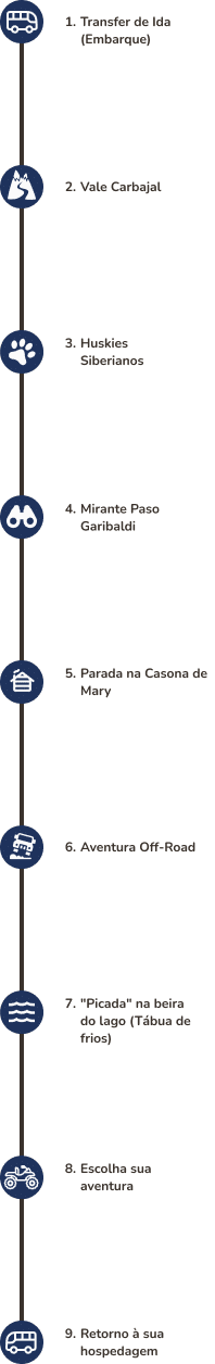 A aventura te leva ao mirante do Vale Carbajal , rodeado de turfeiras e montanhas; depois, ao criadouro de cães huskies siberianos de Siberianos del Fuego, onde você vai encontrar esses cachorrinhos cheios de energia; e em seguida, para o mirante do Passe Garibaldi, nossa passagem transcordilheirana, com vistas para os Lagos Escondido e Fagnano.