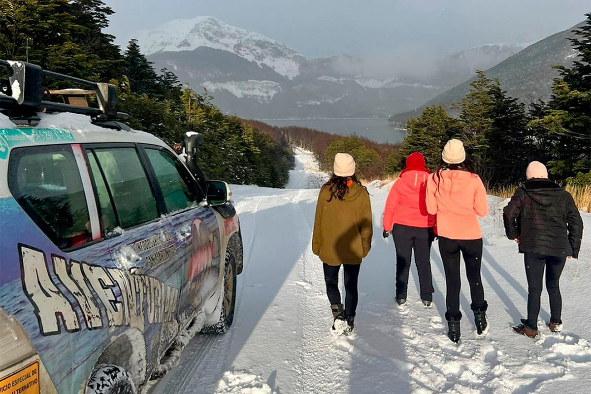 Em inverno el recorrido incluye las paradas en los puntos emblemáticos y el almuerzo o las actividades exclusivas de la temporada al aire libre (cuatriciclos con orugas y la caminata con raquetas en la nieve). El frío no es un obstáculo, no hace falta gastar en ropa técnica: con vestirse en capas es suficiente. Y si no contás con todo, podés alquilar la vestimenta en Ushuaia.