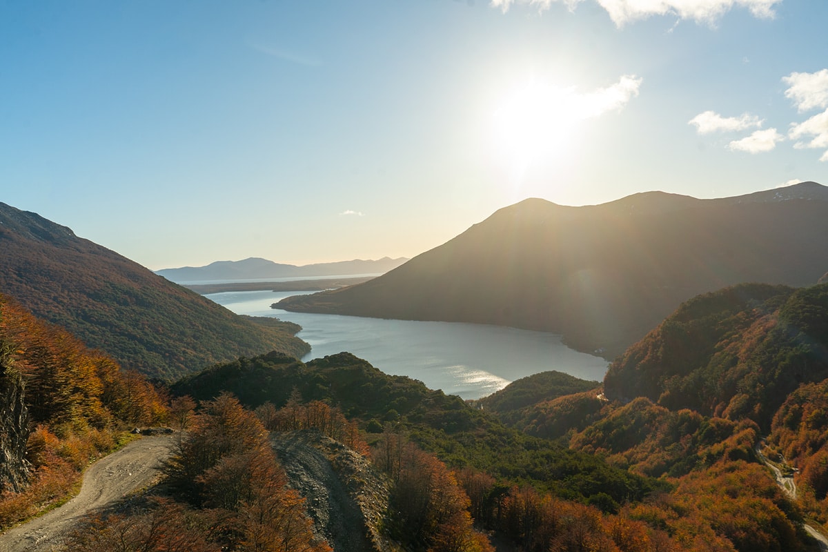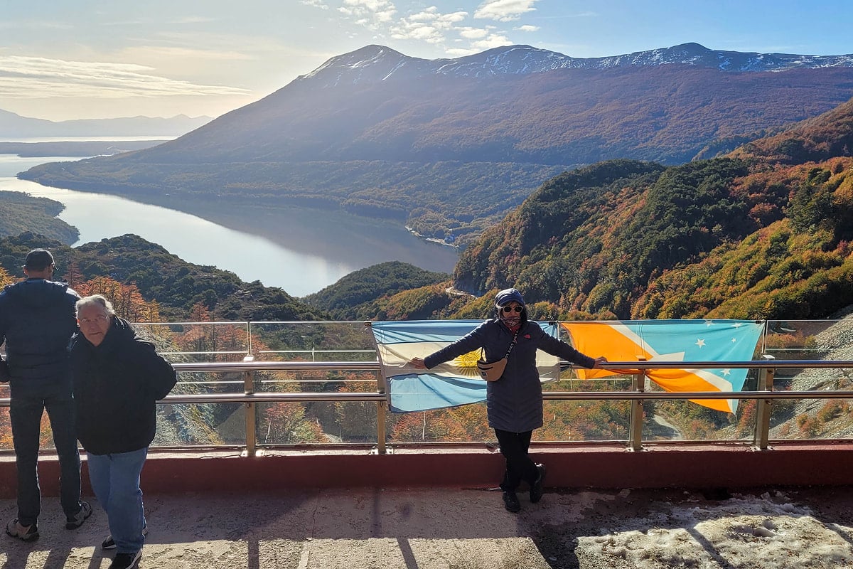 La primera parada es el mirador del Valle Carbajal, un valle de origen glaciar que en outono se transforma en una paleta de colores rojos, naranjas y amarillos. Desde este punto se observan las extensas turberas e o montañas que enmarcan la vista, entre ellas la Sierra Alvear con cumbres como el Monte Alvear y el Monte Krund, además de las laderas del Cerro Bonete y, a lo lejos, la Sierra Sorondo. Una postal clásica de la Ruta Nacional N°3, realzada por la intensidad del otoño fueguino.