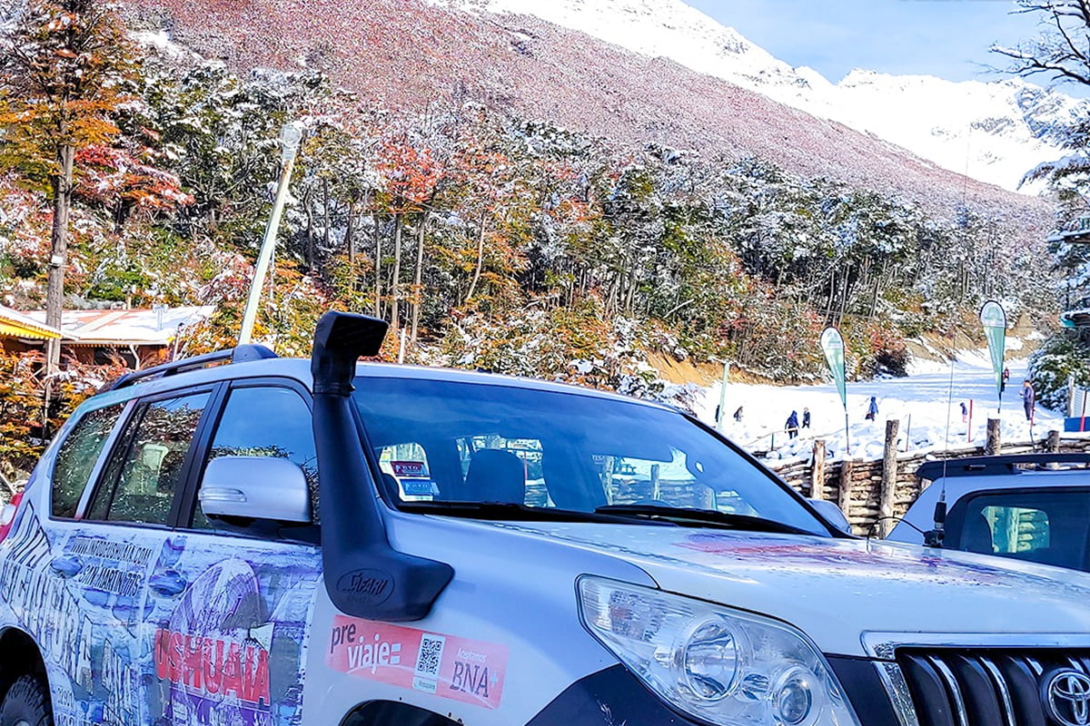 La jornada comienza cuando te pasamos a buscar por tu alojamiento en Ushuaia en nuestras camionetas 4×4 Toyota Land Cruiser Prado. Al dejar atrás la ciudad, la Ruta Escénica Nacional N°3 se abre paso entre montañas y bosques cubiertos de nieve. El paisaje blanco marca el inicio de un día distinto en el Fin del Mundo.
