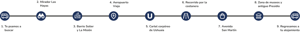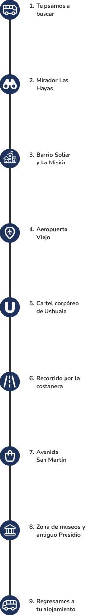 En esta experiencia vas a conocer todo aquello que hace de Ushuaia un destino único. A bordo de nuestro vehículo cómodo y calefaccionado, y junto a nuestro guia local especializado, vas a recorrer bairros históricos como El Solier e La Misión, o Shopping Paseo del Fuego, o Parque Industrial e a Avenida San Martín, corazón social y comercial de la ciudad. También vas a conocer la ubicación de los museos más importantes, como o Museo Marítimo y del Presidio e o Museo del Fin del Mundo, lugares que luego podés visitar con más tiempo por tu cuenta si querés seguir explorando la historia local.
