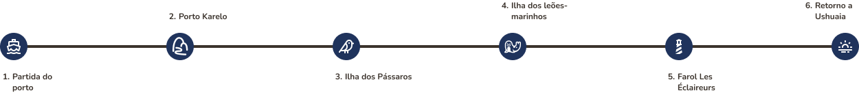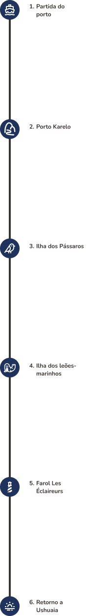 Nós nos encontramos diretamente no Porto Turístico, localizado a poucas quadras do centro da cidade, e nos preparamos para a aventura que vamos viver. A partir do instante em que você embarca no catamarã, sentirá a emoção única de navegar por um dos canais mais famosos do mundo. O ar austral, a vista panorâmica de Ushuaia a partir da água e o conforto do nosso catamarã garantem a você uma experiência memorável desde o primeiro minuto.