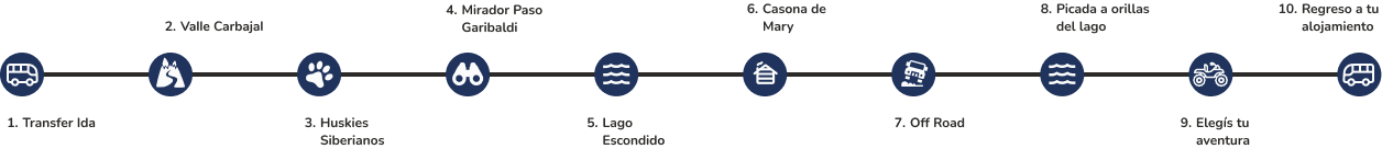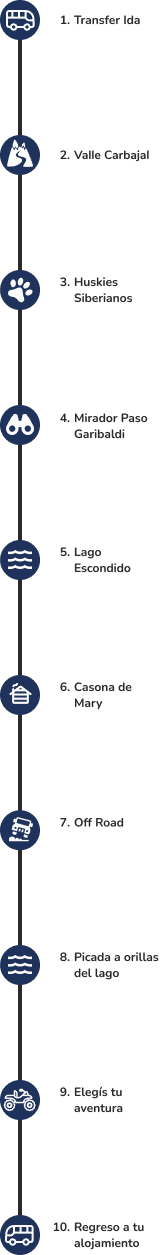 A aventura leva você ao mirante Valle Carbajal, cercado por turfeiras e montanhas; ao canil de huskies siberianos Siberianos del Fuego, onde você encontrará esses cães cheios de energia; e ao mirante do Paso Garibaldi, nossa passagem transandina com vista para os lagos Escondido e Fagnano. A aventura continua pelo circuito histórico Garibaldi, atravessando antigos caminhos de lenhadores até chegar à margem do Lago Escondido.