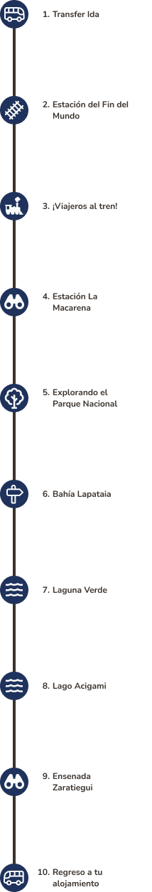 Al descender del tren, nuestro minibus y nuestro guía te van a estar esperando para continuar explorando el Parque Nacional Nacional Tierra del Fuego. Vas a conocer diferentes sectores del parque, donde los bosques de lengas y ñires, las turberas, los lagos de origen glaciar y las montañas que rodean Ushuaia forman un entorno natural único. En cada parada, nuestro guía experto te va a compartir información sobre la historia, la geografía y la biodiversidad de esta zona protegida, considerada uno de los paisajes más representativos de Ushuaia.