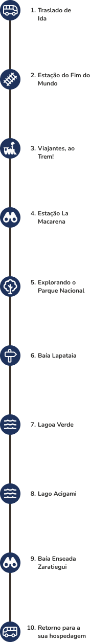 Depois de uma tarde repleta de história e natureza, iniciamos o retorno para sua hospedagem em Ushuaia. Você sentirá que em apenas um dia vivenciou a verdadeira essência do Fim do Mundo, entre paisagens únicas, relatos históricos e a beleza natural da Terra do Fogo.