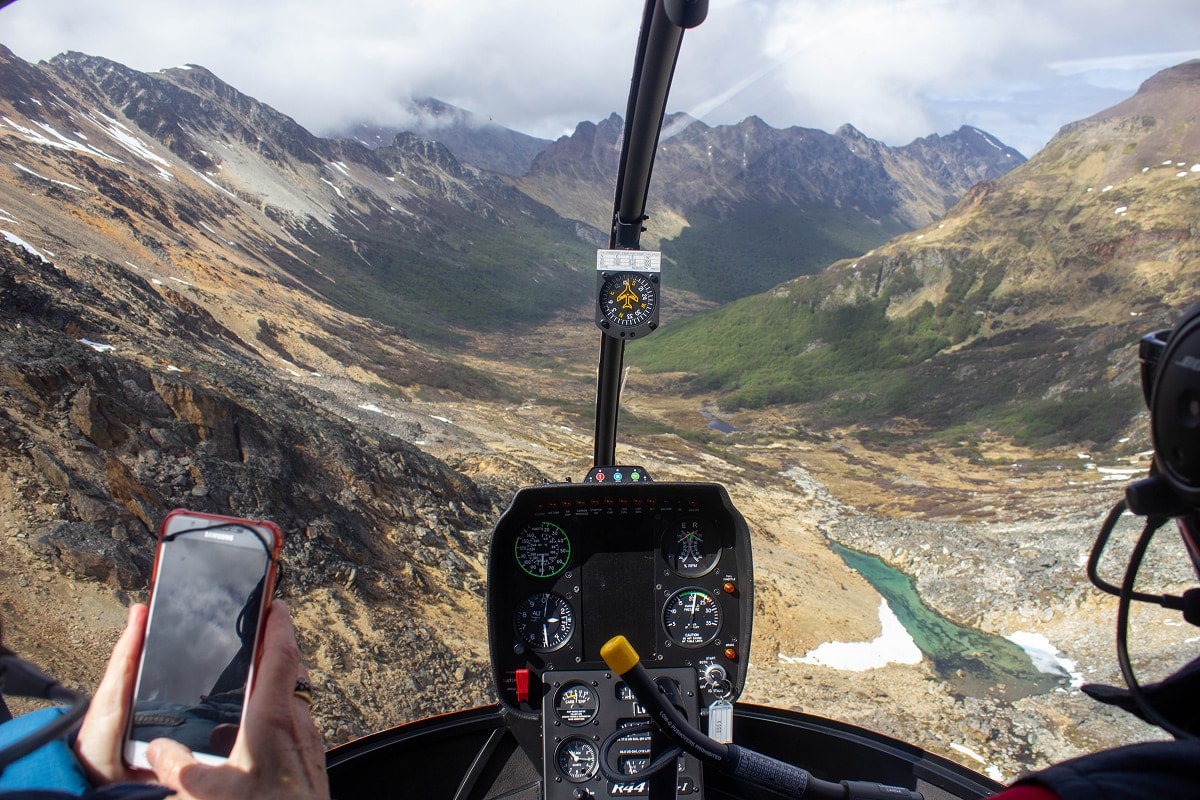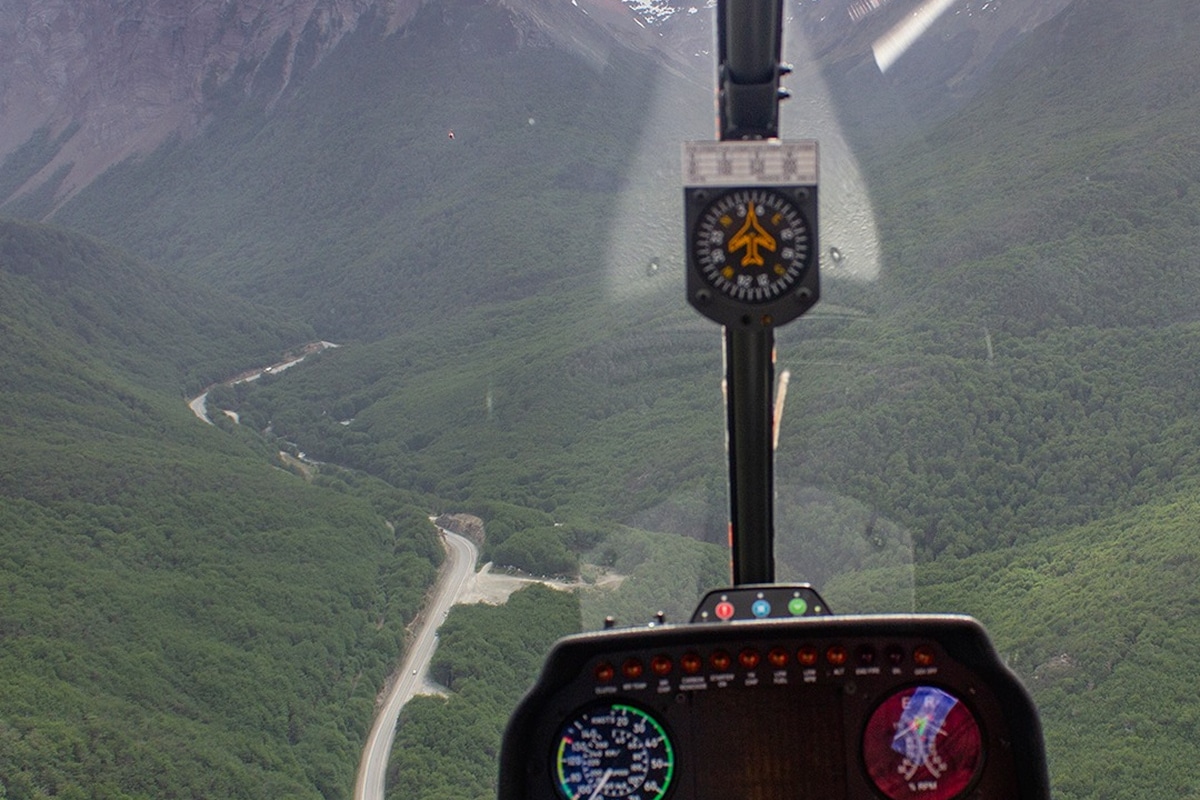 Al virar rumbo al Este, vas a poder contemplar desde el helicóptero la ciudad de Ushuaia abrazada por la majestuosa Cordillera de los Andes, admirando desde las alturas atractivos emblemáticos como el Glaciar Martial, el impactante Monte Olivia y el característico Monte Cinco Hermanos. En esta época del año, el paisaje muestra su máximo esplendor, ofreciendo escenarios únicos para que captures las mejores fotografías aéreas.